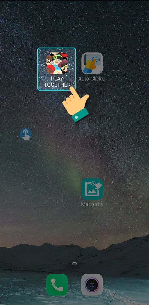 Quay ra màn hình chính điện thoại > truy cập game Play Togetther > trong giao diện game nhấn vào biểu tượng bàn tay của ứng dụng Macrorify > chọn biểu tượng play