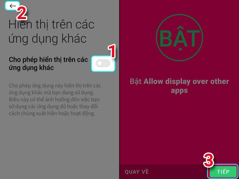 Bước 4 : chọn mở tính năng cho phép hiện thị trên các ứng dụng khác rồi nhán voà tượng mũi tên để quay ra và chọn tiếp
