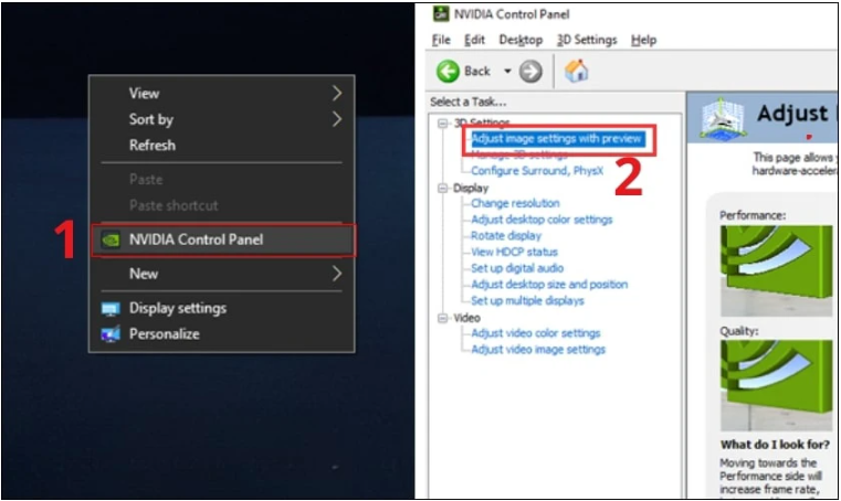 Bước 1 Để mở NVIDIA Control Pâel,hãy nhấp chuột phải lên màn hình và chọn NVDIA Control Panel,để tiến hành cài đặt cho toàn hệ thống,bạn hãy sử dụng tuỳ chọn Adjust image settings with preview