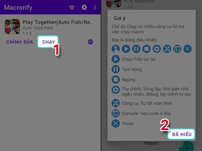 Quay ra màn hình chính điện thoại > truy cập game Play Togetther > trong giao diện game nhấn vào biểu tượng bàn tay của ứng dụng Macrorify > chọn biểu tượng play