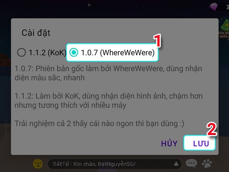 Các bước tiếp theo nhấn lưu > đến bước chọn phiên bản 1.0.7 và chọn Lưu là thành công > tiếp tục chọn địa điểm câu cá và điều chỉnh vị trí câu