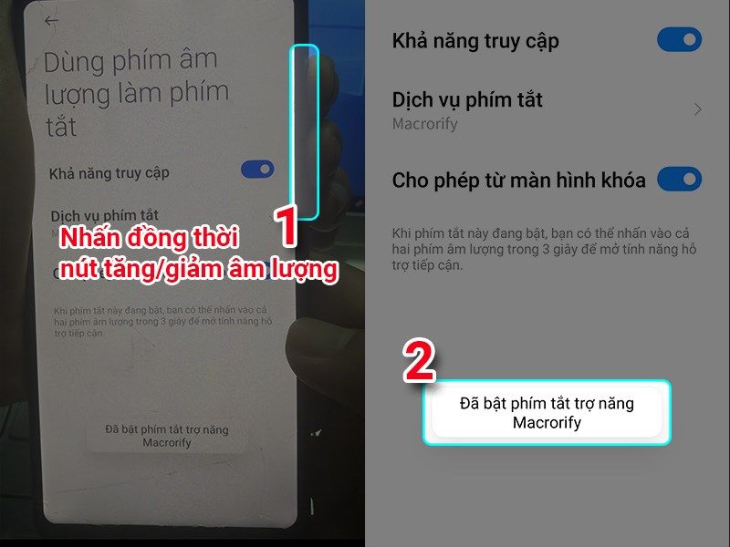 Dùng phím âm lượng làm phím tắt > sau đó mở khả năng truy cập và nhấn vào dịch vụ phím tắt > chọn ứng dụng bạn nhấn vào ứng dụng Macrorify và chọn cho phép.