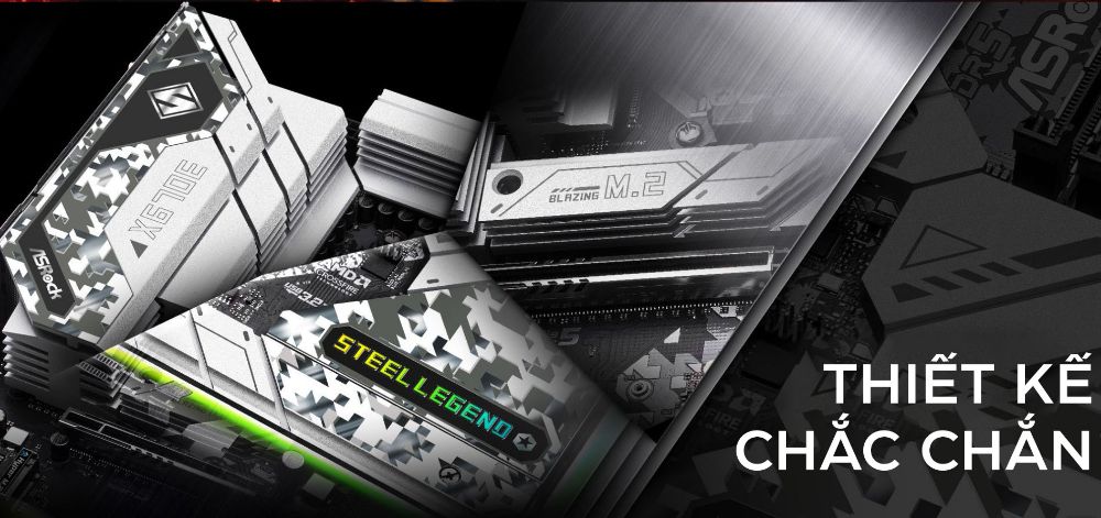 Sở hữu phong cách thiết kế đặc trưng của dòng Steel Legend, bo mạch chủ có tông màu trắng xám quân sự nổi bật, kết hợp với tấm tản nhiệt kim loại lớn bao phủ khu vực VRM, chipset và khe M.2. PCB 6 lớp cao cấp giúp tăng độ bền và ổn định, đặc biệt khi hoạt động liên tục hoặc ép xung.